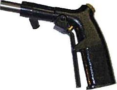 Heavy duty trigger operated sandblast gun. 5/16" i.d. hardened steel nozzle. Full length trigger, 1/4" brass air flow pluger (not a needle valve). Cast aluminum body, hardened steel wear parts.